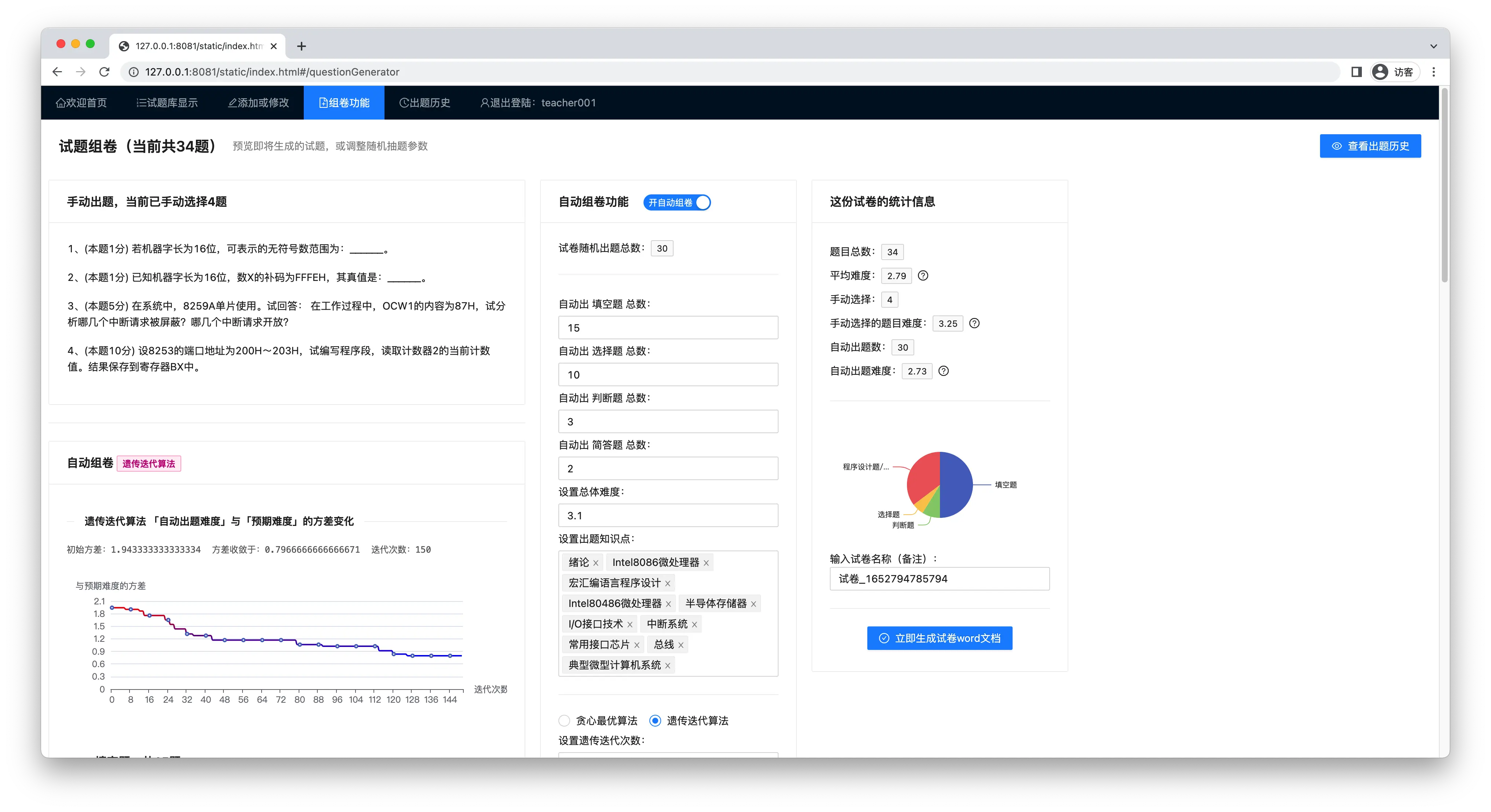 简介:自动组卷系统,遗传算法、贪心算法,支持导入题库,手动选择、自动组卷,生成排版美观的Word文档,前后端分离WebApp,Java SpringBoot + React