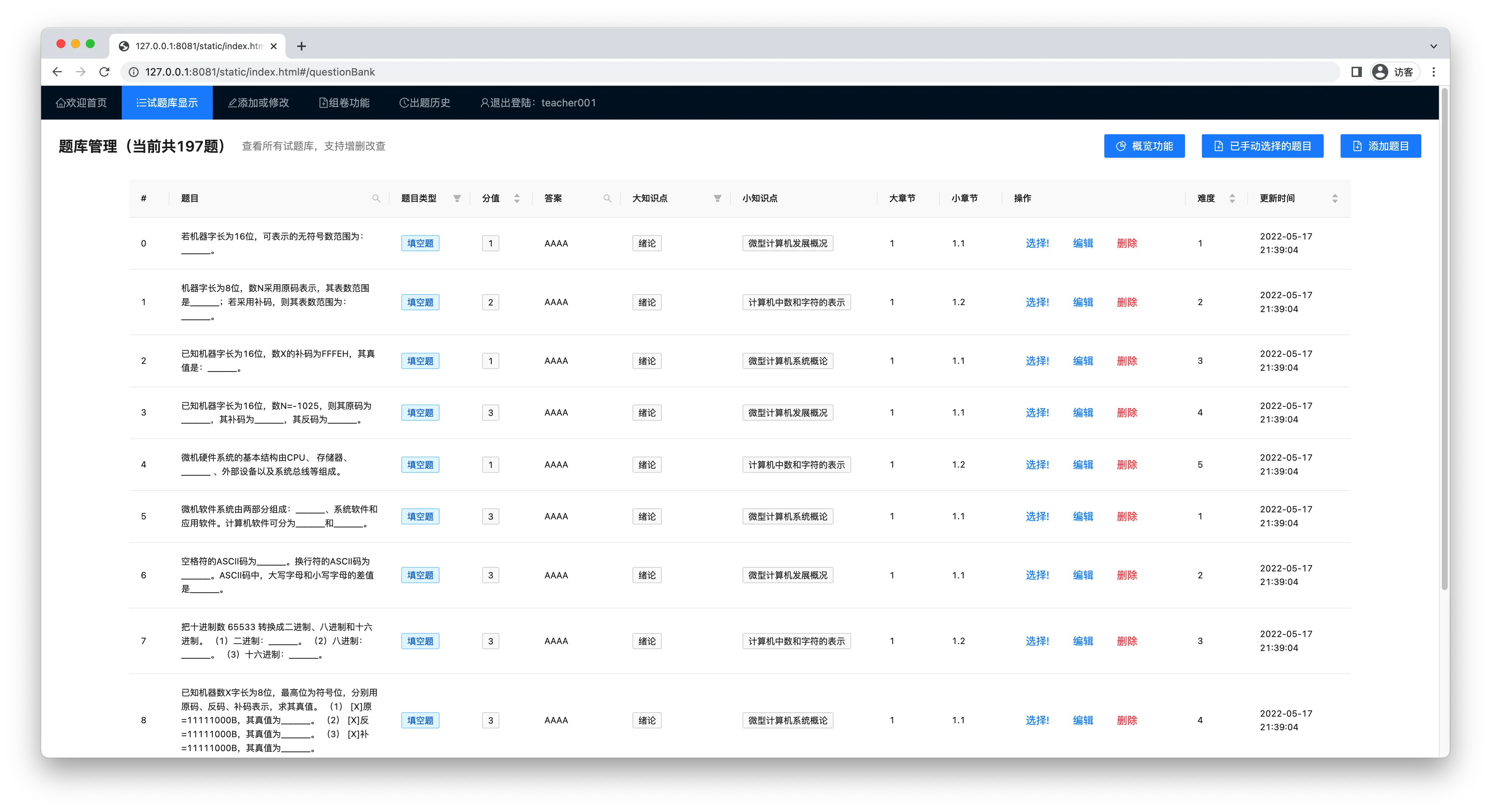 - 题库管理,支持填空题、选择题、判断题、设计题、阅读题多种类型,所有题目可自由增删改查;