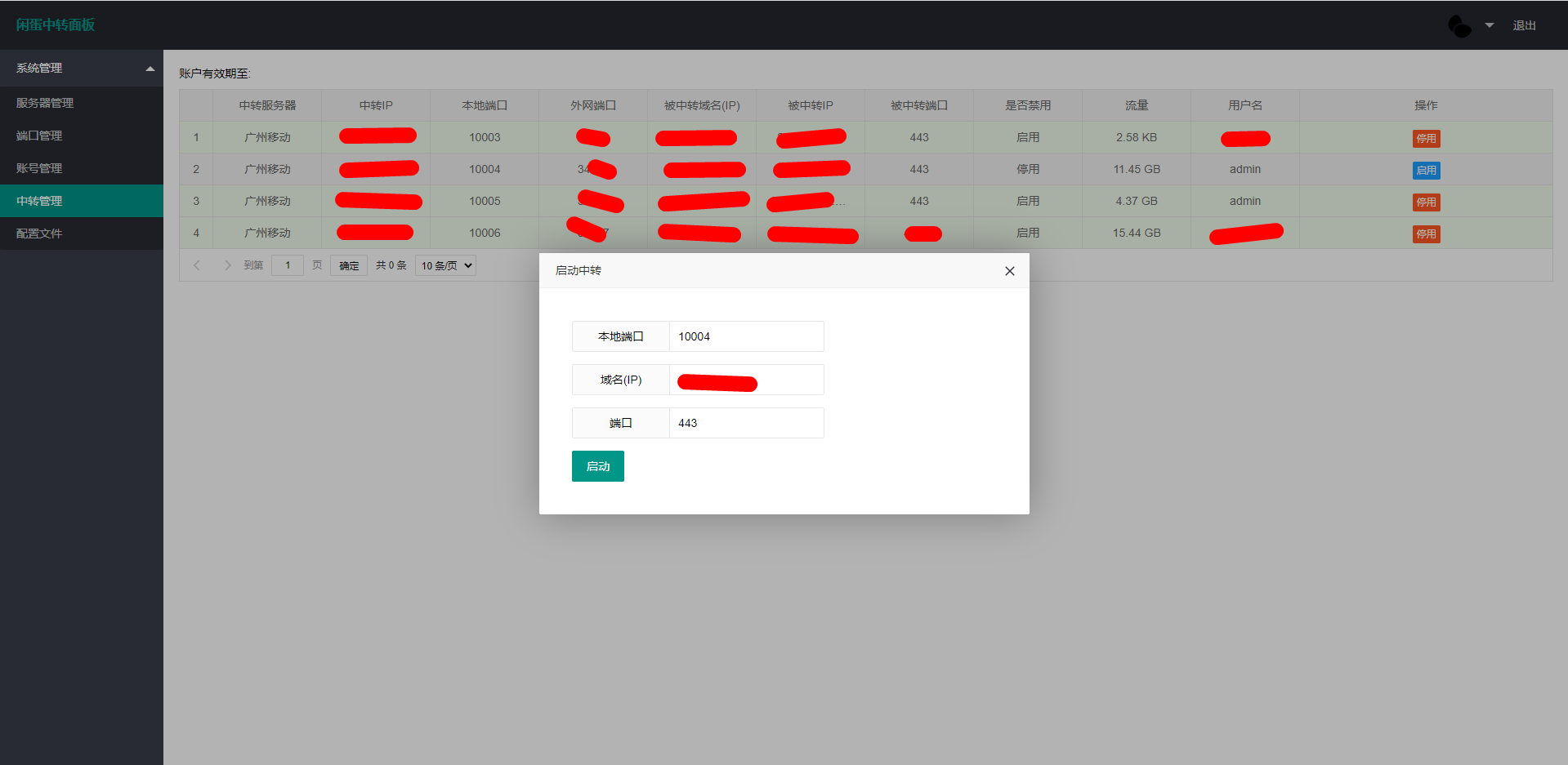闲(的)蛋(疼)中转面板 基于Java编写的中专管理平台 主要功能 1. 服务器管理 维护中转服务器, 也就是这个面板可以同时管理多台, 主要有配置上用户名密码即可 2. 端口管理 维护服务器的端口 3. 账号管理 为你的租户创建账号, 分配端口, 到期时间(到期自动停机), 流量限制(还没做) 中转管理 租户使用该功能自己设置转发 4.配置管理 可以托管一些配置, 这个自己灵活运用