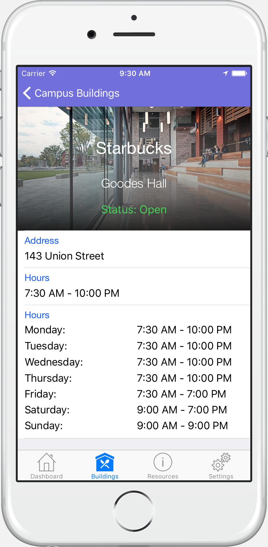 QTap incorporates a strong, organized visual design for displaying daily class schedules, operating hours for on-campus buildings, and helpful university contact information for Queen's students.