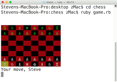 $ ruby game.rb- Your screen should now look like this: [start_game]: https://raw.githubusercontent.com/zelaznik/chess/master/images/start_game.gif
