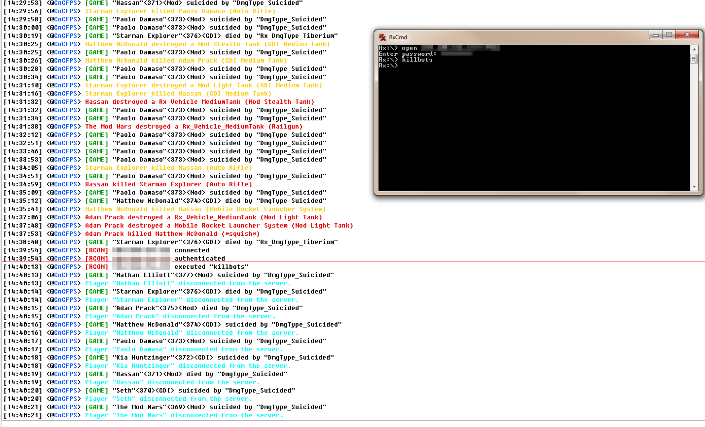 RxCmd is a remote administration utility for Renegade-X (UDKGame) servers. It allows you to open connections to your Renegade-X server and administrate it with ease. At the moment, it's only capable of a few commands (addbots, killbots, and say); however, it's highly extensible. Others are free to add their own commands to the system and submit a pull-request to have their commands included.
